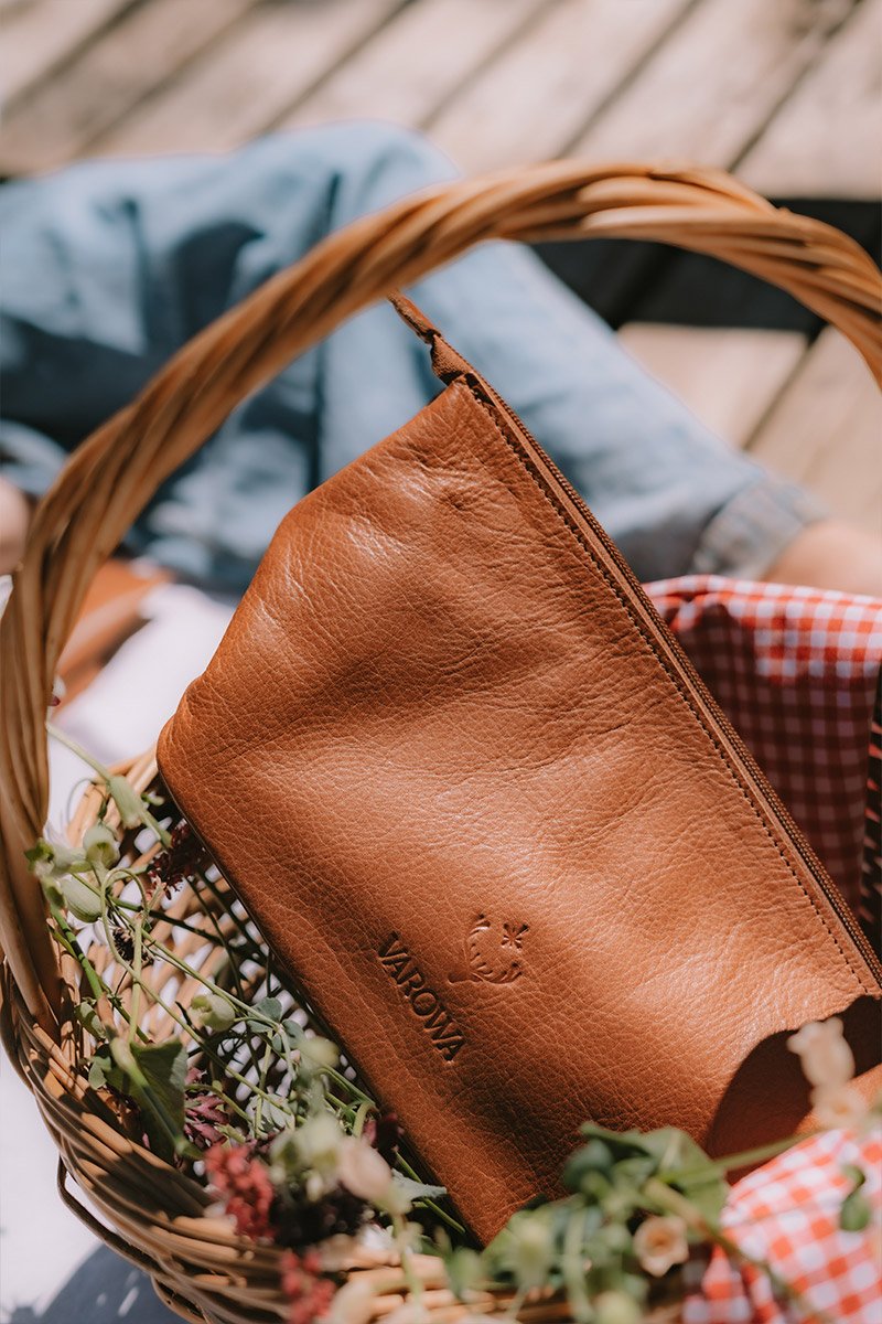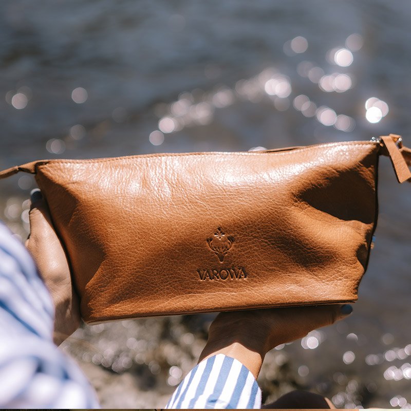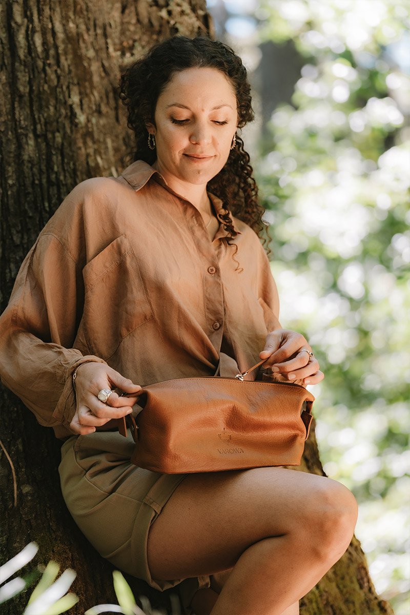 Necessaire confeccionado en cuero vacuno premium curtido vegetal con taninos naturales extraídos de cortezas de árboles de la Patagonia Argentina.