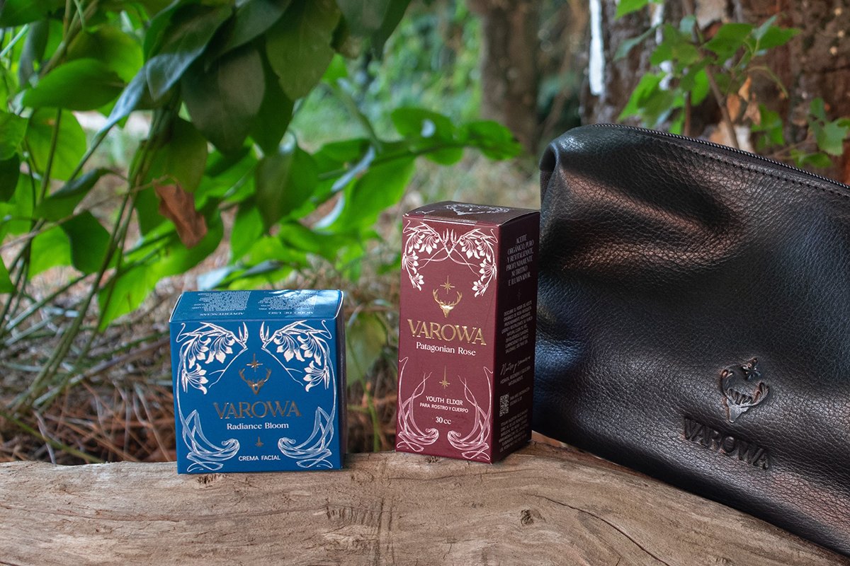 Incluye la Crema Radiance Bloom, Patagonian Rose Youth Elixir Óleo de Rosa Mosqueta orgânico e uma bolsa de higiene feita de couro bovino curtido vegetal premium com taninos naturais extraídos da casca de uma árvore na Patagônia, Argentina..